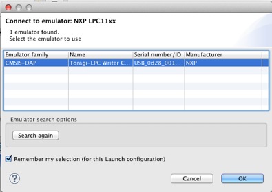 ここで、Search for any enabled emulatorボタンをクリックすると、Toragi_LPC Writer CMSI-DAPが見つかりますので、 ここで、OKボタンを押します。