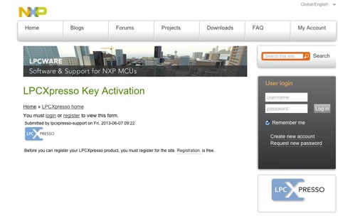 アクティベートには、以下のページでregisterからユーザ登録して、loginしてください。 LPCXpresso Key Activation
