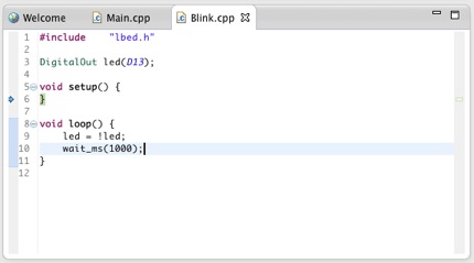 今度は、Main.cppの21行目で止まりますので、またStep Intoを実行します。今度は、Blink.cppの9行目で止まります。