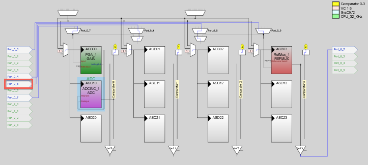 PGA_1の設定は、Gainを2.667, InputをAnalogColumn_InputMux_0にセットし、P0[5]と接続しています。