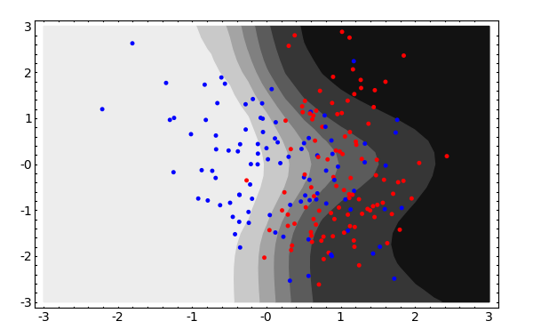 PRMLの第5章-多層パーセプトロン分類問題の例題、図5.4 (赤が多層パーセプトロンの結果、緑が最適な分類結果)