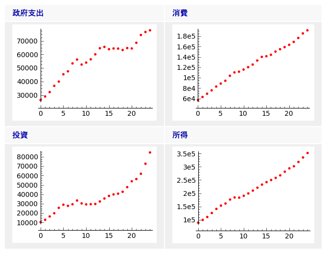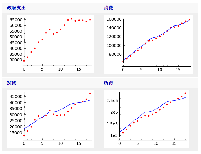 # 計算値(青)と実測値(赤)のプロット gtPlot = list_plot(GtList, rgbcolor='red', figsize=3) calCtPlot = list_plot(calCtList, plotjoined=true, figsize=3) ctPlot = list_plot(CtList, rgbcolor='red', figsize=3) calItPlot = list_plot(calItList, plotjoined=true, figsize=3) itPlot = list_plot(ItList, rgbcolor='red', figsize=3) calYtPlot = list_plot(calYtList, plotjoined=true, figsize=3) ytPlot = list_plot(YtList, rgbcolor='red', figsize=3) # プロット表示 html.table([["政府支出", "消費"], [gtPlot, (calCtPlot + ctPlot)], ["投資", "所得"], [(calItPlot + itPlot), (calYtPlot + ytPlot)]])