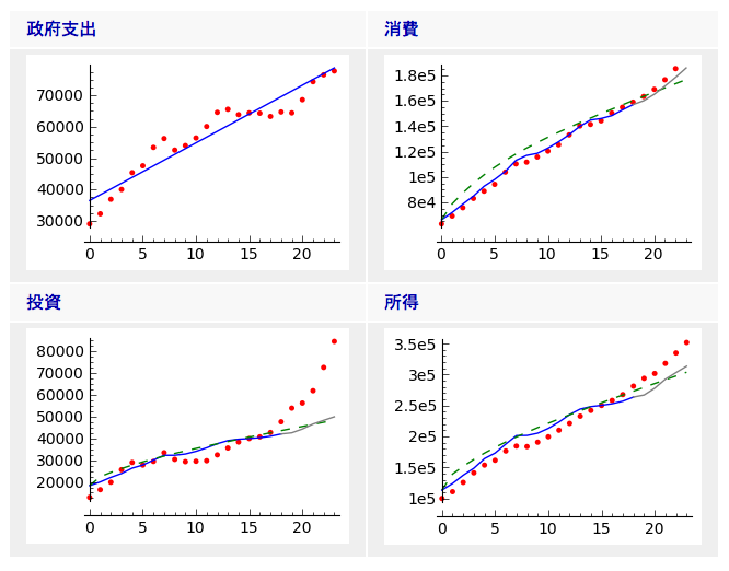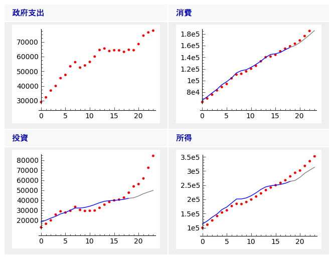 # 教師用+検証用の実測値(赤) ctPlot = list_plot(CtData[1:24], rgbcolor='red', figsize=3) itPlot = list_plot(ItData[1:25], rgbcolor='red', figsize=3) ytPlot = list_plot(YtData[1:25], rgbcolor='red', figsize=3) gtPlot = list_plot(GtData[1:25], rgbcolor='red', figsize=3) # 計算値(青)、検証値(灰) valCtPlot = list_plot(zip(range(18,24), valCtList), plotjoined=true, rgbcolor ='gray', figsize=3) valItPlot = list_plot(zip(range(18,24), valItList), plotjoined=true, rgbcolor ='gray', figsize=3) valYtPlot = list_plot(zip(range(18,24), valYtList), plotjoined=true, rgbcolor ='gray', figsize=3) # プロット ctPlt = (calCtPlot + ctPlot +valCtPlot) itPlt = (calItPlot + itPlot + valItPlot) ytPlt = (calYtPlot + ytPlot + valYtPlot) html.table([["政府支出", "消費"], [gtPlot, ctPlt], ["投資", "所得"], [itPlt, ytPlt]])