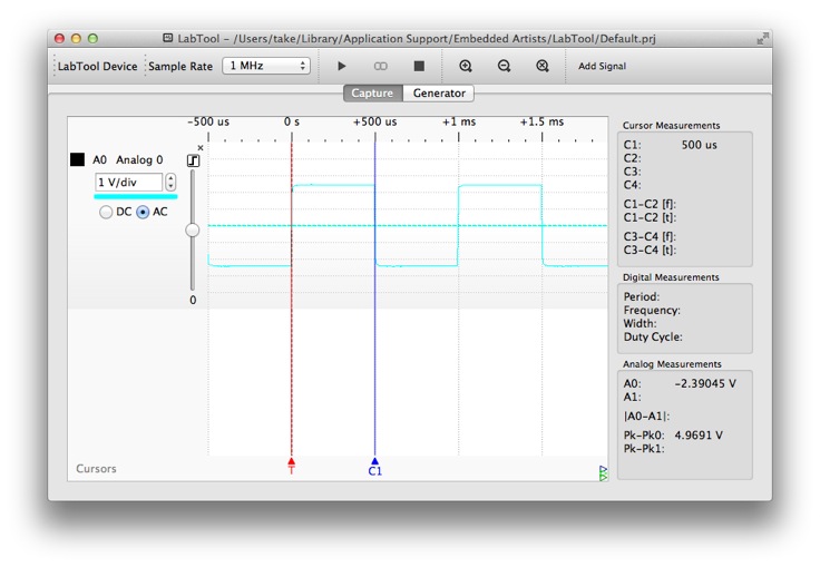 オシロスコープの1KHzのプローブ信号をキャプチャーしたところです。