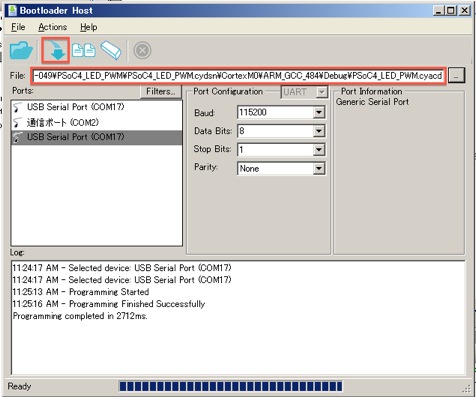 SW1を押してPrototyping KitをUSBに挿入すると、LEDが速く点滅します。 次に、Tools→Bootloader Host...を選択し、Fileのボタンで PSoC4_LED_PWM.cydsn\CortexM0\ARM_GCC_484\Debug\PSoC4_LED_PWM.cyacd