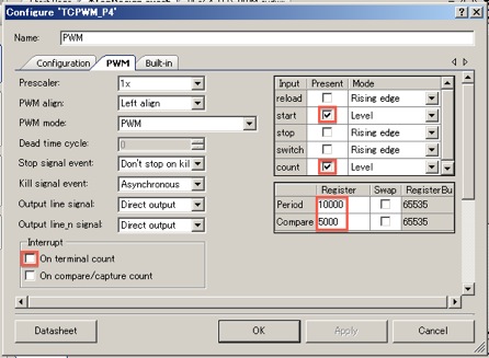 Workspace ExplorerのPSoC4_LED_PWM.cydwrをクリックし、以下の様に設定します。