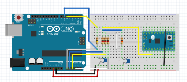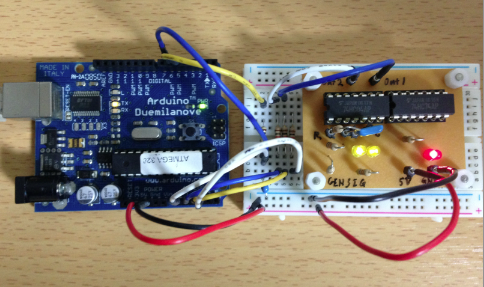 以下の様に接続して、Arduinoオシロスコープを使って信号生成ツールから2つの方形波の NAND信号を表示してみました。