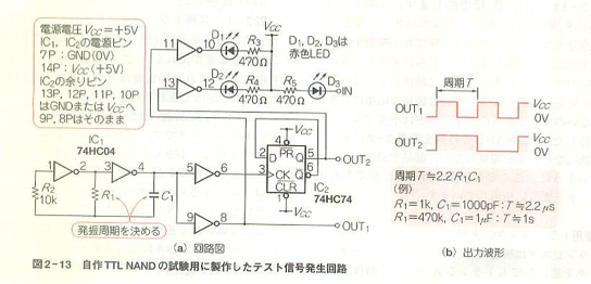 GENSIGの回路をトラ技2004/09の図2−13から引用します。この回路は74HC74のDフリップフロップ と74HC04のインバータを使った発振回路で周期が1:2の2つの方形波を生成しています。 RとCを調整することで、様々な周波数の波形を作れるのでとても便利です。
