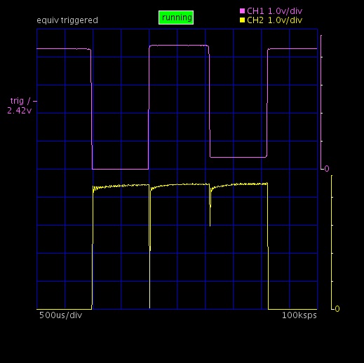 Arduinoオシロスコープの波形です。2チャンネルしか表示できないので、2msのVin1とVoutを表示しています。 ひげもはっきり測定できます。