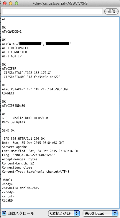 AT+CIPSENDコマンドで送信するデータのバイト数を指定します。 今回は、"GET /hello.html HTTP/1.0\r\n\r\n\r\n"を送信するので、30バイトとなります。 AT+CIPSEND=30を入力してください。