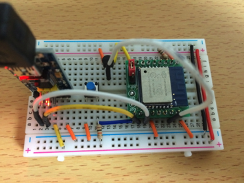 ブレッドボードに以下の様にタクトスイッチを追加します。 抵抗値は10KΩ、ESP-WROOM-02の10ピン(IO4)に接続します。
