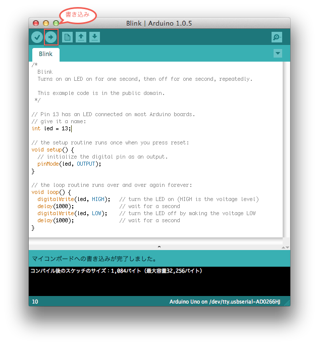 先ほどと同様に書き込みボタンをクリックしてスケッチをArduinoに書き込みます。 ボタンを押すとLEDが点灯することを確認してください。