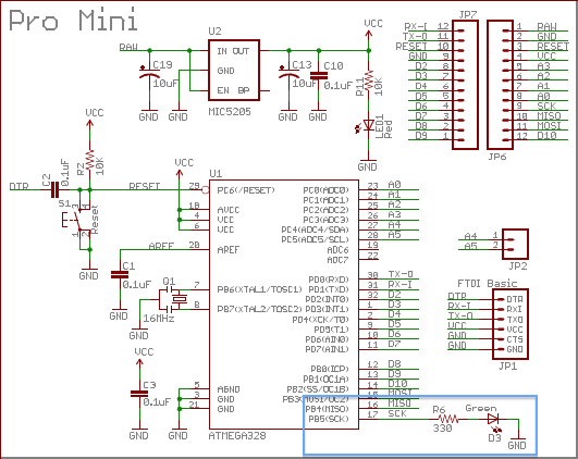 Arduino Pro MiniのLEDの回路は、以下の様になっています。青く囲んだ部分をみてください。 Greenと書かれたLEDの向きがGNDに向かっていますので、ピンがHIGHの時にLEDが点灯します。