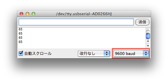結果を見るには、Arduino IDEのシリアルモニターを使用します。 ツール→シリアルモニターを選択し、シリアルモニターを開きます。 以下の様な画面が表示されますので、通信速度が9600 baudになるようにセットしてください。 明るさによって出力される値が変わりますので、試してみてください。