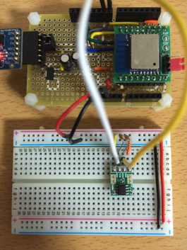 ADT7410とESP8266との接続には、ESP8266版lbeDuinoのD8(SDA)とD9(SCL)と ADT7410のSDA、SCLをそれぞれ接続します。 ADT7410にモジュール内にプルアップの抵抗が付いていますが、今回はブレッドボードの4.7KΩの抵抗を付けてプルアップしています。