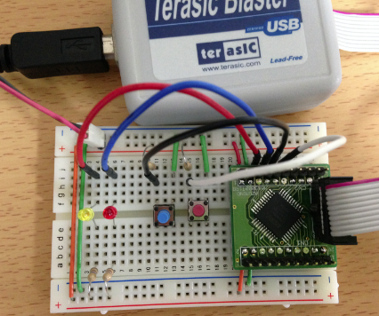ボードのテストのために、LED2個とタクトスイッチ2個をブレッドボードに付けて 負論理で動作するようにしました。 TerasicBlasterのケーブルは、赤の線が1番ピンになるように接続します。