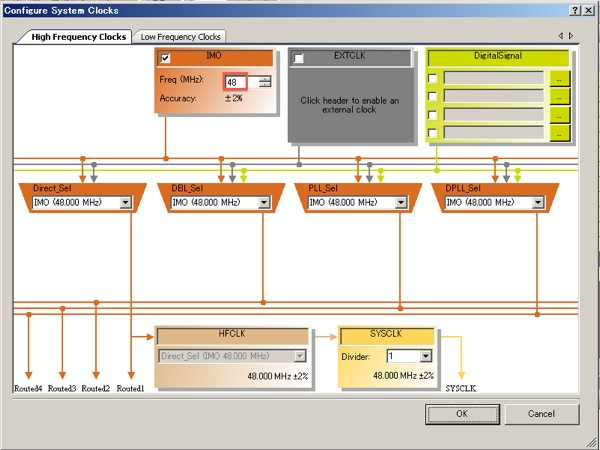 以下の様に内蔵発振回路(IMO)を使って最高の48MHzにセットします。