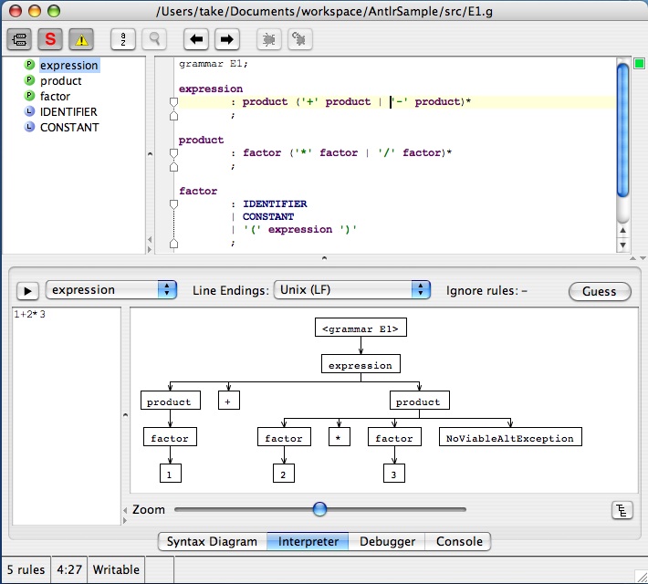 次の図が、ANTLRWorksを使ってユーザの作った文法(E1)に1+2*3を入力したときの構文木を表示しています。 このように文法を記述するだけで、テストが行え、文法のチェックができるという夢のようなツールです。