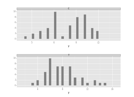 ヒストグラムの追加は、geom_histogram関数で行い、binwidth=1と指定することで、 yを幅=1で集計します。fill='grey'で塗りつぶしの色をグレイに指定しています。