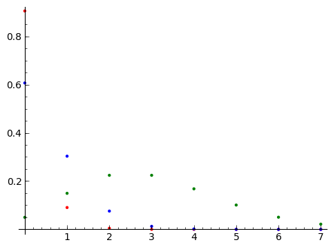 # 3章のメインのグラフは、図3.9だと思う。 # 0.5, 1.1, 1.7のyを0.1, 0.5, 3.0としてポアソン分布を表示 # Fig. 2.6 # ポアソン関数p(y, λ)を定義 def p(y, lam): return lam^y*e^(-lam)/factorial(y) g = Graphics() for lam, cls in [(0.1, 'red'), (0.5, 'blue'), (3.0, 'green')]: g = g + list_plot([p(y, lam) for y in range(8)], color=cls) g.show(figsize=5)