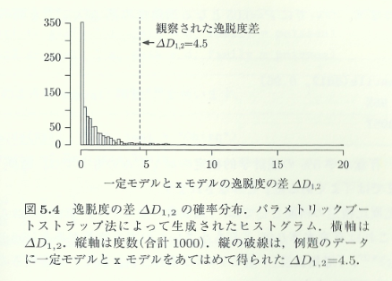 どんな統計モデルにも使える尤度比検定が、5章のテーマです。ターゲットの統計モデル(xモデル)と一定値を使った意味の無いモデル :帰無仮説の尤度比を使って帰無仮説棄却の可否を判断します。 *1