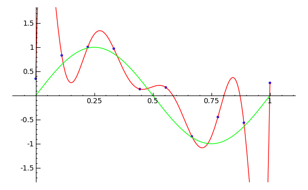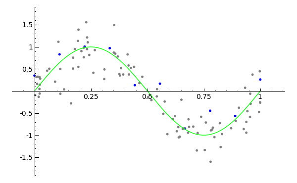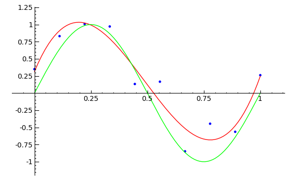 # PRMLのsin曲線のデータ data = matrix([ [0.000000, 0.349486], [0.111111, 0.830839], [0.222222, 1.007332], [0.333333, 0.971507], [0.444444, 0.133066], [0.555556, 0.166823], [0.666667, -0.848307], [0.777778, -0.445686], [0.888889, -0.563567], [1.000000, 0.261502], ]); X = data.column(0) t = data.column(1) M = 3; # データのプロット sin_plt = plot(sin(2*pi*x),[x, 0, 1], rgbcolor='green'); data_plt = list_plot(zip(X, t)); data_plt (data_plt + sin_plt).show()