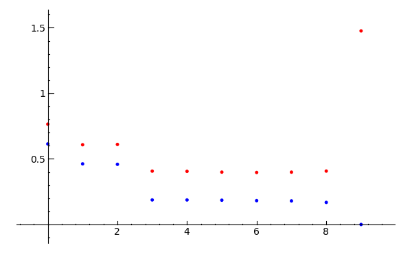 # 平均自乗平方根誤差 Erms_t = []; Erms_t100 = []; for M in range(10): # 計画行列Φ Phi = matrix([[ _phi(x,j) for j in range(0, (M+1))] for x in X.list()]); Phi_t = Phi.transpose(); # ムーア_ベンローズの疑似逆行列 Phi_dag = (Phi_t * Phi).inverse() * Phi_t; # 平均の重み Wml = Phi_dag * t; f = lambda x : sum(Wml[i]*x^i for i in range(0, (M+1))); Erms_t += [sqrt(sum((t[i] - f(X[i]))^2 for i in range(len(t)))/len(t))]; Erms_t100 += [sqrt(sum((t100[i] - f(X100[i]))^2 for i in range(len(t100)))/len(t100))]; Erms_t_plt = list_plot(Erms_t); Erms_t100_plt = list_plot(Erms_t100, rgbcolor = 'red'); (Erms_t_plt + Erms_t100_plt).show(); # グラフの傾向はPRMLと同じですが、値が若干ずれている?