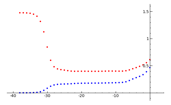 # Ermsを取って過学習の度合いを見る # 平均自乗平方根誤差 Erms_t = []; Erms_t100 = []; for ln_lam in range(-38, 1): lam = n(e^ln_lam); Phi = matrix([[ _phi(x,j) for j in range(0, (M+1))] for x in X.list()]); Phi_t = Phi.transpose(); # ムーア_ベンローズの疑似逆行列 Phi_dag = (lam*matrix((M+1),(M+1),1) + Phi_t * Phi).inverse() * Phi_t; # 平均の重み Wml = Phi_dag * t; f = lambda x : sum(Wml[i]*x^i for i in range(0, (M+1))); Erms_t += [[ln_lam, sqrt(sum((t[i] - f(X[i]))^2 for i in range(len(t)))/len(t))]]; Erms_t100 += [[ln_lam, sqrt(sum((t100[i] - f(X100[i]))^2 for i in range(len(t100)))/len(t100))]]; Erms_t_plt = list_plot(Erms_t); Erms_t100_plt = list_plot(Erms_t100, rgbcolor = 'red'); (Erms_t_plt + Erms_t100_plt).show();