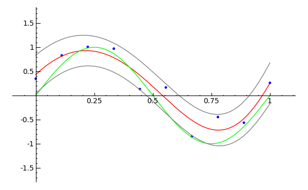 # ベイズ的なフィッティング # α=5*10^-3, β=11.1を使用 alpha = 5*10^-3; beta = 11.1; Phi = matrix([[ _phi(x,j) for j in range(0, (M+1))] for x in X.list()]); Phi_t = Phi.transpose(); # ムーア_ベンローズの疑似逆行列 Phi_dag = (alpha*matrix((M+1),(M+1),1) + beta*Phi_t * Phi).inverse() * Phi_t; # 平均の重み Wml = beta*Phi_dag * t; f = lambda x : sum(Wml[i]*x^i for i in range(0, (M+1))); # 分散 def s(x): phi_x = vector([x^i for i in range(M+1)]); s_sqr = 1/beta + phi_x * Phi_dag * phi_x; return sqrt(s_sqr); s_u_plt = plot(lambda x : f(x) + s(x), [x, 0, 1], rgbcolor='grey'); s_d_plt = plot(lambda x : f(x) - s(x), [x, 0, 1], rgbcolor='grey'); y_plt = plot(f, [x, 0, 1], rgbcolor='red'); (y_plt + data_plt + sin_plt + s_u_plt + s_d_plt).show(ymin=-1.5, ymax=1.5);