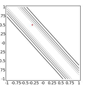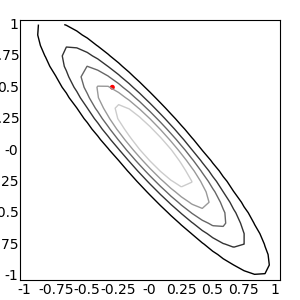 最初の1点目の尤度関数をwの真の値a=(-0.3, 0.5)(赤い点)と一緒にプロットしたのが、最初の図です。