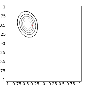 次に原書式(3.53)から求めた事後確率と真の値a=(-0.3, 0.5)(赤い点)と一緒にプロットしました。 図3.7と同じように事前分布と尤度分布を掛け合わせた形になっています。