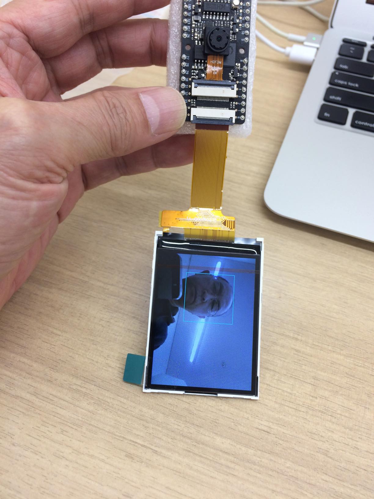 顔が認識されるその範囲がREPLのコンソールに表示され、LCDには水色の矩形で 表示されます。