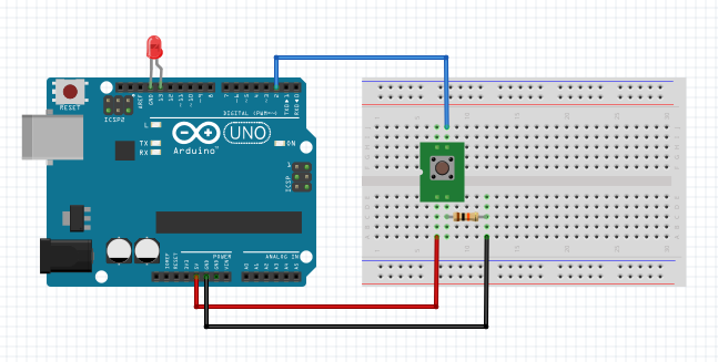 次にbutton_ledの枠の緑の旗をクリックするとスクリプトが動き出します。 タクトスイッチを押すとLEDが点灯し、離すとLEDが消えます。 注意深く見るとタクトスイッチを押したときにDigital2がfalseからtrueに変わるのが分かります。