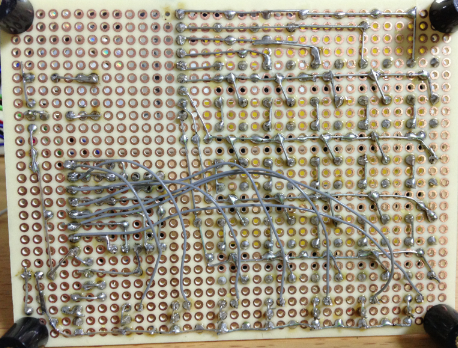 Arduino版GMC-4には、1個の7セグメントLEDと7個のLED、そして24個のタクトスイッチに 2個のトランジスタと10個の抵抗をユニバーサル基板に載せただけのとても簡単なものです。 後はArduinoのプログラムですべて処理します。