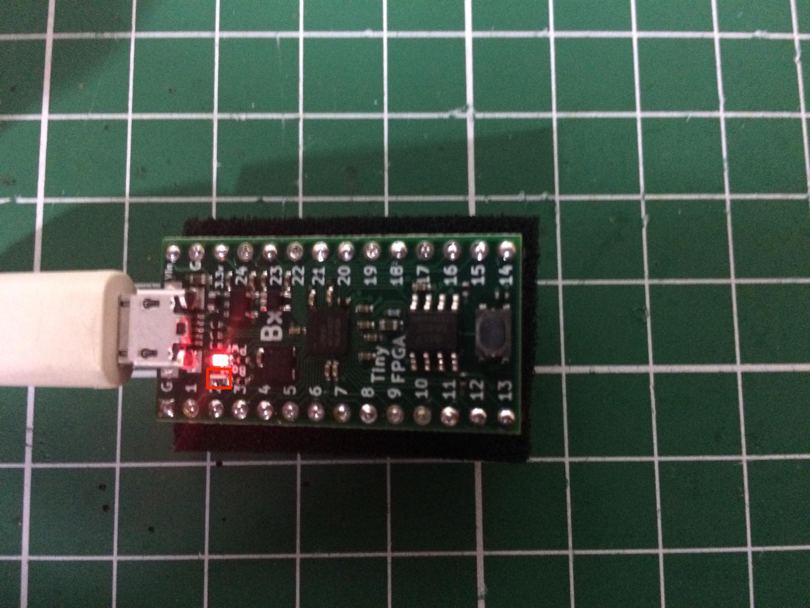 以上でTinyFPGAに回路が書き込まれ、2番ピンの右側のLEDが小さく点灯します。(真上から見ると消灯しているように見えます)