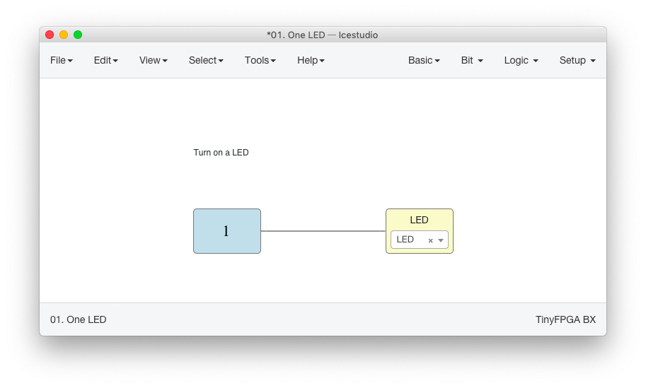 IceStdudioでボード選択でTinyFPGA-Bxを選択すれば、ボードのピン番号で回路を組むことができます。 サンプルのOne LEDを開いてLEDのピンを割り当てた画面です。