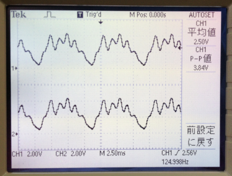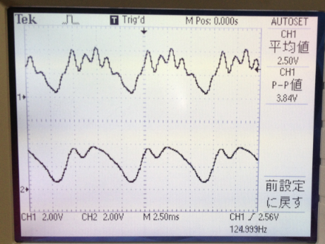 次数5の場合の出力波形(上がオリジナル、下が合成波形)です。