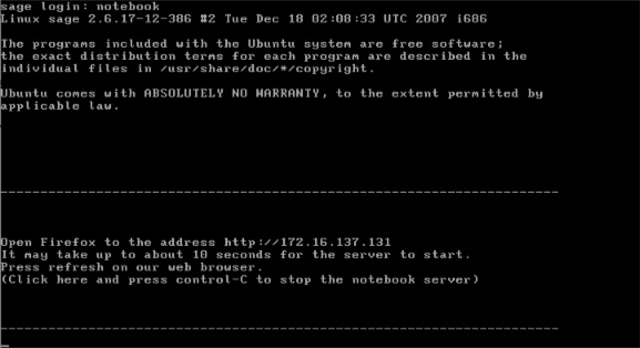 次にコピーしたsageフォルダ内のsageアイコンをダブルクリックするとターミナルが起動し、初期設定を行った後以下のようなプロンプトを表示します。