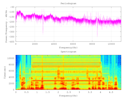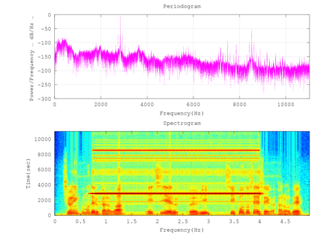 ピリオドグラムでは2800と8500Hzあたりにピンと飛び出たところが見え、スペクトグラムでは同じ周波数に 濃い赤の帯が見えます。これがエコーノイズの正体です。