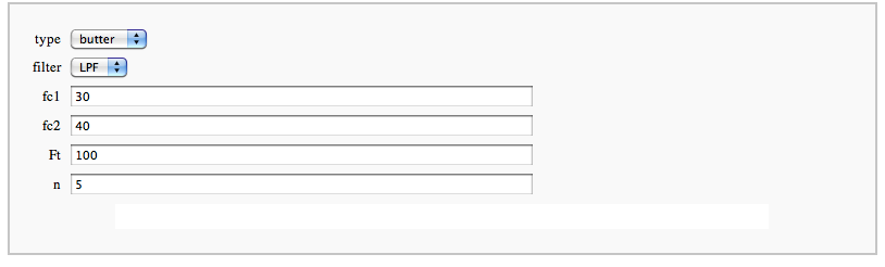 def _(type=selector(["butter", "cheby1", "cheby2"]), filter = selector(["LPF", "HPF", "BPF", "BRF"]), fc1=30, fc2=40, Ft=100, n=5):