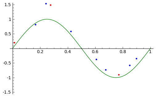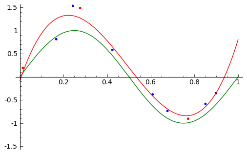 (blue_plt + red_plt + sin_plt + fit_plt).show(xmin=0, xmax= 1, ymin=-1.5, ymax=1.5)