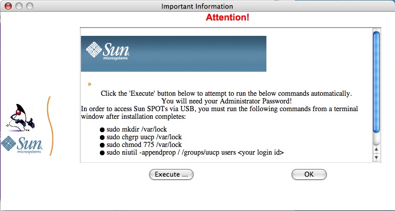 付属のCD-ROMを挿入し、SunSPOTSDKInstaller.jarをダブルクリックするだけです。 途中、/var/lockの作成とuucpグループの追加をするかを問い合わせるダイアログが でますので、
