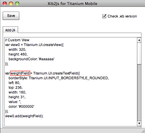 // Xib2JSで生成されたコード < Xib2JSで生成されたコード>をここにペーストまたはインクルード // Xib2JSのビューとカレントウィンドウの結合 var win = Ti.UI.currentWindow; win.add(view0); // ← 生成されたコードのルートビューがview0だからこれをウィンドウに追加 // 部品の初期値をセット <日付や体重の初期値をセット> // コールバック関数をセット <保存やキャンセルボタンのコールバック関数を定義し、セットする>