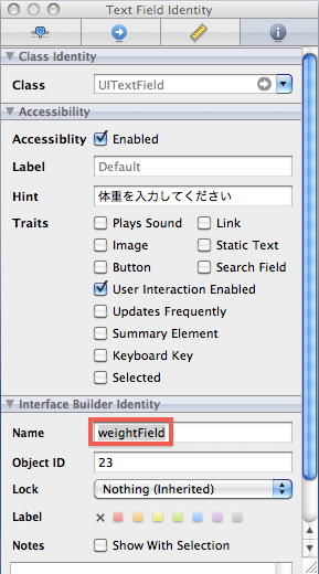 また、作成した部品の名前を定義すると、その名前がjavascriptの部品の変数名になります。 部品の名前は、Inspectorウィンドウでセットします。