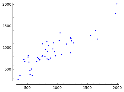 # sklearnのRidge回帰を使って最適解を見つける from sklearn.linear_model import Ridge clf = Ridge(alpha=1.0) clf.fit(X, y) pred = clf.predict(X) list_plot(zip(y, pred), figsize=5)