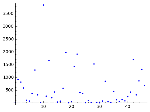 # 異常度aを求める lam = 1.0 coefs = clf.coef_ score = clf.score(X, y) sig2 = (lam*sum(coefs^2) + score)/N y_bar = uscrime['y'].mean() X_bar = uscrime[vars].mean().values a = (y - y_bar - coefs.dot((X - X_bar).T))^2/sig2 list_plot(a, figsize=5)