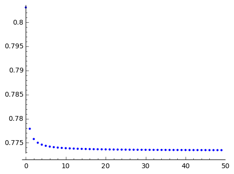 # alphaの値を変えてみる => alpha=1.0で十分よい値が求まっていることが分かる lams = np.arange(0, 5, 5/50) Res = [] for lam in lams: clf = Ridge(alpha=lam) clf.fit(X,y) Res += [clf.score(X, y)] list_plot(Res, figsize=5)