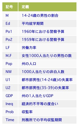 # UScrimeの説明を表6.1から転記 vars = ['M', 'Ed', 'Po1', 'Po2', 'LF', 'M.F', 'Pop', 'NW', 'U1', 'U2', 'GDP', 'Ineq', 'Prob', 'Time'] abbr = ['14-24歳の男性の割合', '平均就学期間', '1960年における警察予算', '1959年における警察予算', '労働力率', '女性1000人当たりの男性の数', '州の人口', '1000人当たりの非白人数', '都市部男性(14-24歳)の失業率', '都市部男性(35-39)の失業率', '州の1人当たりGDP', '経済的不平等の度合い', '収監率', '刑務所での平均収監期間'] html.table(zip(vars, abbr), ['記号', '定義'], )