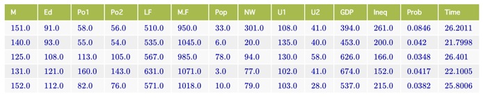 M So Ed Po1 Po2 LF M.F Pop NW U1 U2 GDP Ineq Prob Time y 1 151 1 91 58 56 510 950 33 301 108 41 394 261 0.084602 26.2011 791 2 143 0 113 103 95 583 1012 13 102 96 36 557 194 0.029599 25.2999 1635 途中省略