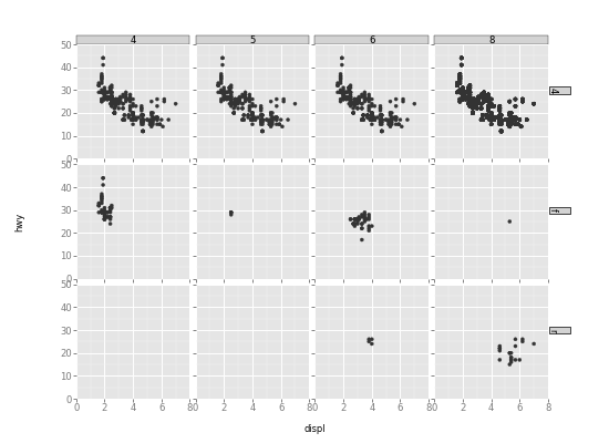 # Rec.11.1 ファセットを使いサブプロットに分割する mpg = RDf2PandaDf('mpg') ggplot(mpg, aes(x="displ", y="hwy")) + geom_point() + facet_grid("drv", "cyl")